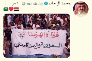 ونشر السفير السعودي لليمن محمد ال جابر صورة للوحة كتب عليها فزنا او انهزمنا السعودية واليمن كلهم منتخبنا .