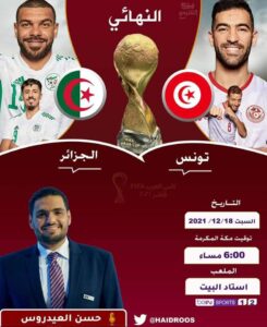 واعلنت بي إن سبورت بأن المعلق الرياضي اليمني حسن العيدروس سيعلق على المباراة النهائية لبطولة كأس العرب بين منتخبي تونس الجزائر .
