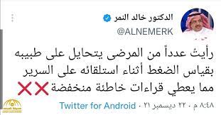 وقال النمر عبر حسابه على تويتر: “رأيتُ عدداً من المرضى يتحايل على طبيبه بقياس الضغط أثناء استلقائه على السرير مما يعطي قراءات خاطئة منخفضة، وهذا أمر خطأ”.