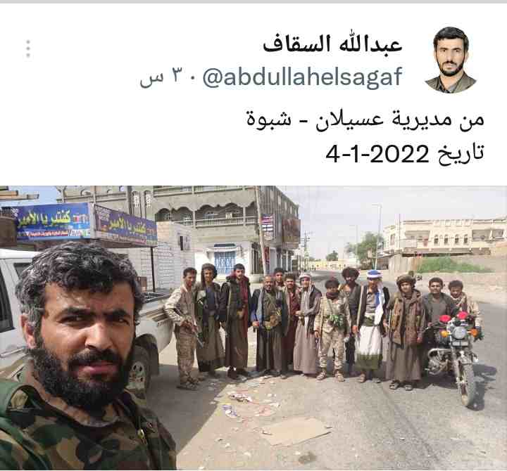 ونشر مراسل قناة المسيرة التابعة لقوات “الحوثيين”، عبدالله السقاف، صورة جديدة تظهر قوات صنعاء في قلب مديرية عسيلان.