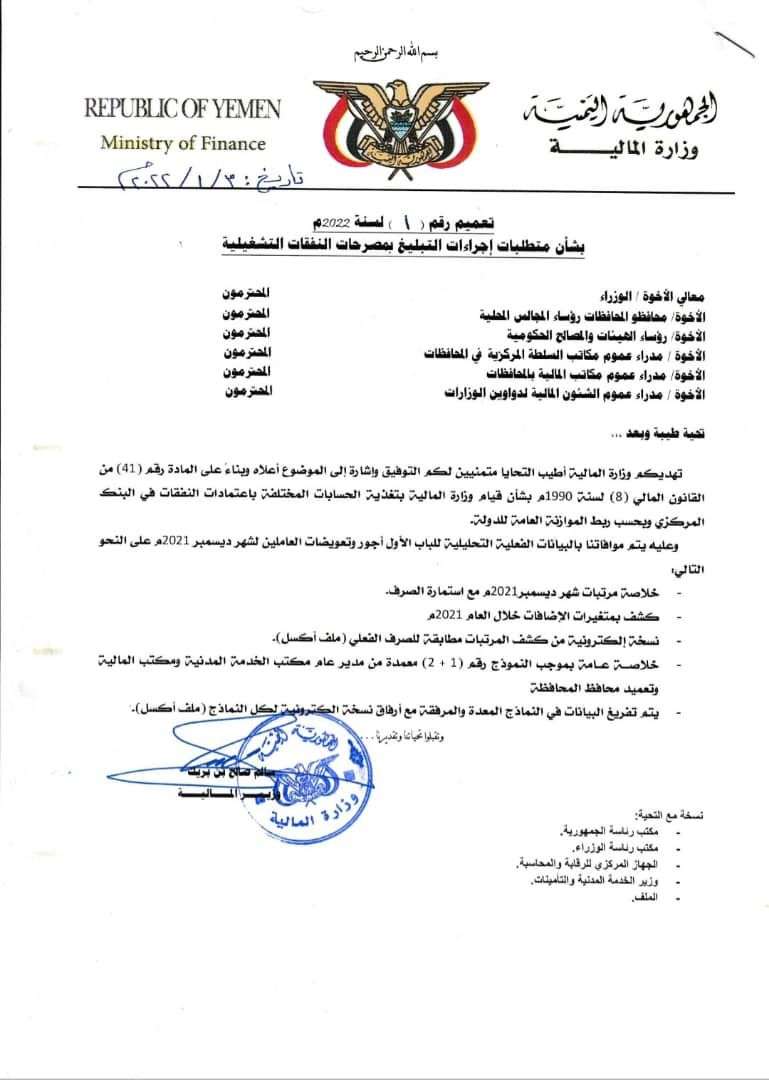 ضمن الإجراءات التصحيحية التي تتخذها حكومة الدكتور معين عبدالملك ، تلبية لمتطلبات المانحين الإقليميين والدوليين ، ومساعي النهوض بمالية الدولة ومواجهة الاختلالات التي اضرت بالاقتصاد الوطني ، أصدرت وزارة المالية بالعاصمة المؤقتة عدن، تعميمين هامين لعام 2022م ، بشأن مكافحة الفساد في المشتريات الحكومية والمناقصات، وكشوفات الرواتب والأجور في المؤسسات الحكومية ووفقاً للصلاحيات الممنوحة للوزارة في القانون،
