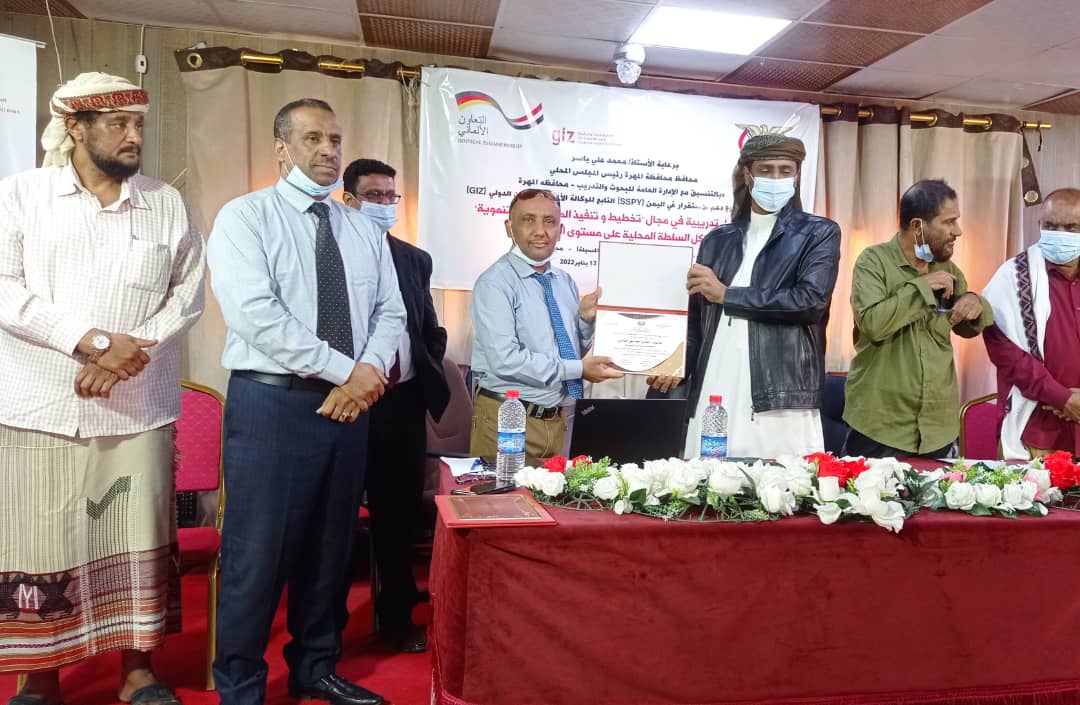 اختتمت اليوم الخميس بقاعة الزعفران الورشه التدريبيه في مجال تخطيط وتنفيذ المشروعات التنمويه لهيكل السلطه المحليه على مستوى مديريات(سيحوت- المسيلة) بتنفيذ ودعم من مشروع دعم الاستقرار في اليمن التابع للوكاله الالمانيه للتعاون الدولي (GiZ) وبتنسيق مع الاداره العامة للبحوث والتدريب بمحافظة المهرة.