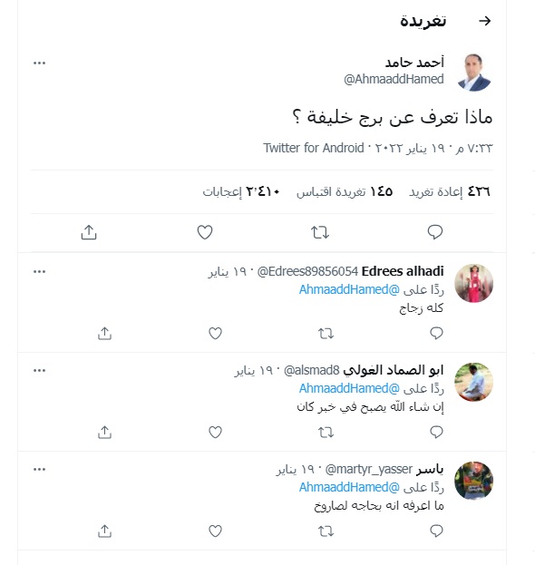 يأتي هذا التهديد عقب أقل من اربعة ايام على تهديد مماثل اطلقه مدير مكتب رئاسة سلطات الحوثيين في العاصمة صنعاء، القيادي احمد حامد، في تغريدة على "تويتر" تساءل فيها: “ماذا تعرف عن برج خليفة”، في إشارة إلى أن البرج دخل ضمن بنك أهداف الحوثيين.