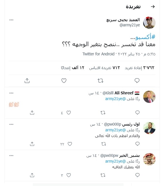 جاء ذلك في تغريدة نشرها على حسابه الرسمي، المتحدث العسكري للحوثيين يحيى سريع، اثارت ردود افعال واسعة لدى مرتادي مواقع التواصل الاجتماعي في دول الخليج لاسيما على منصة التدوين المصغر "تويتر"، بالتزامن مع تكرار الحوثيين مهاجمة الامارات.