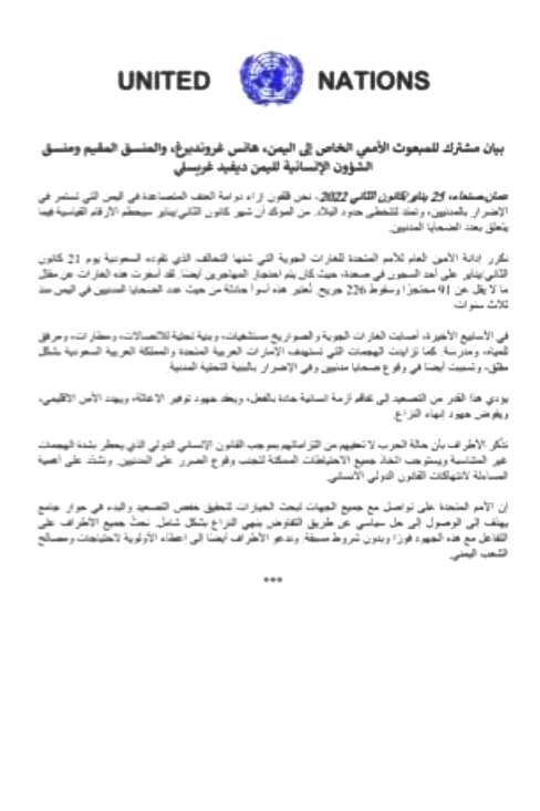 بيان المبعوث الأممي هانز غروندبرغ، والمنسق الاممي المقيم للشؤون الإنسانية ديفيد غريسلي، شدد على أن القانون الدولي "يستوجب اتخاذ جميع الاحتياطات الممكنة لتجنب وقوع الضرر على المدنيين". وأكد على "أهمية المساءلة لانتهاكات القانون الدولي الإنساني في اليمن".