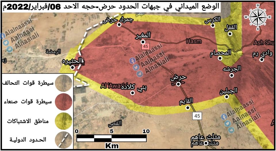 حصل اليمن السعيد على خريطة توضح الوضع الميداني في جبهات الحدود في منطقة غربي محافظة حجة ليوم الاحد الموافق 06/فبراير/2022م.