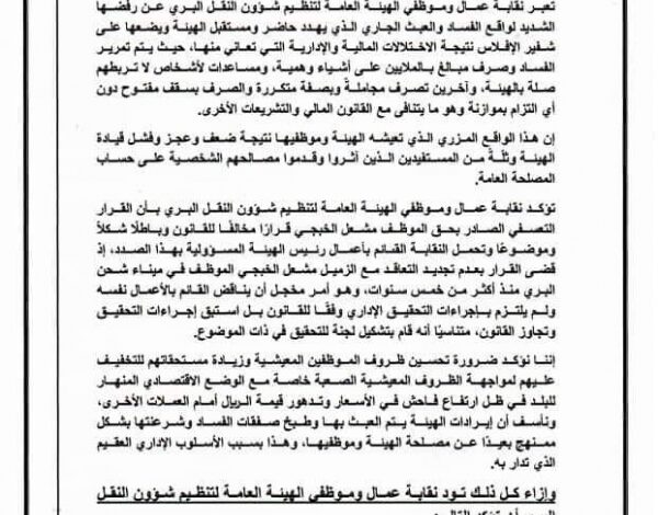 وعبّرت النقابة عن رفضها “لواقع الفساد والعبث الجاري الذي يهدد حاضر ومستقبل الهيئة ويضعها على شفير الإفلاس نتيجة الاختلالات المالية والإدارية التي تعاني منها، حيث يتم تمرير الفساد وصرف مبالغ بالملايين على أشياء وهمية، ومساعدات لأشخاص لاتربطهم صلة بالهيئة، وآخرين يصرف لهم مجاملة”.