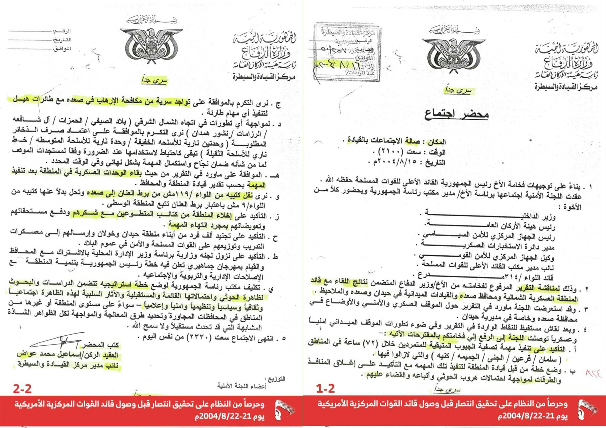 2- وثيقة وزارة الدفاع مركز القيادة والسيطرة .. محضر اجتماع بتاريخ 16/8/2004م