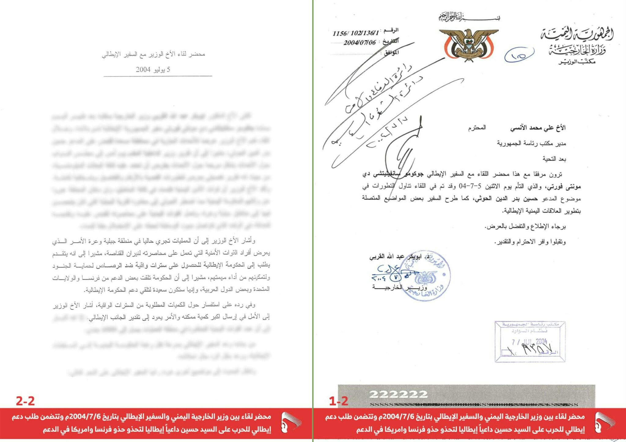 3- وثيقة محضر لقاء وزير الخارجية اليمنية بالسفير الإيطالي بتاريخ 6/7/2004م