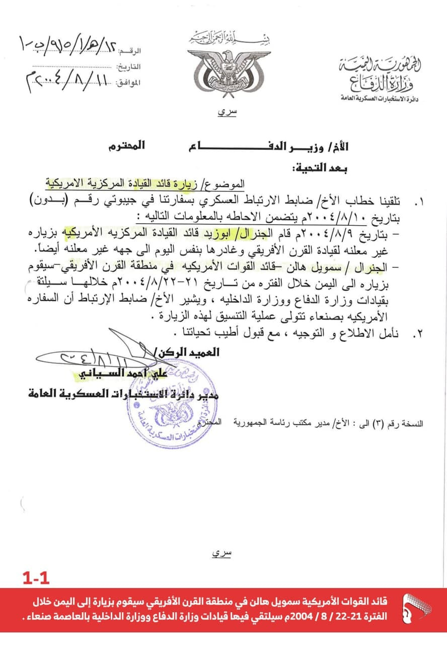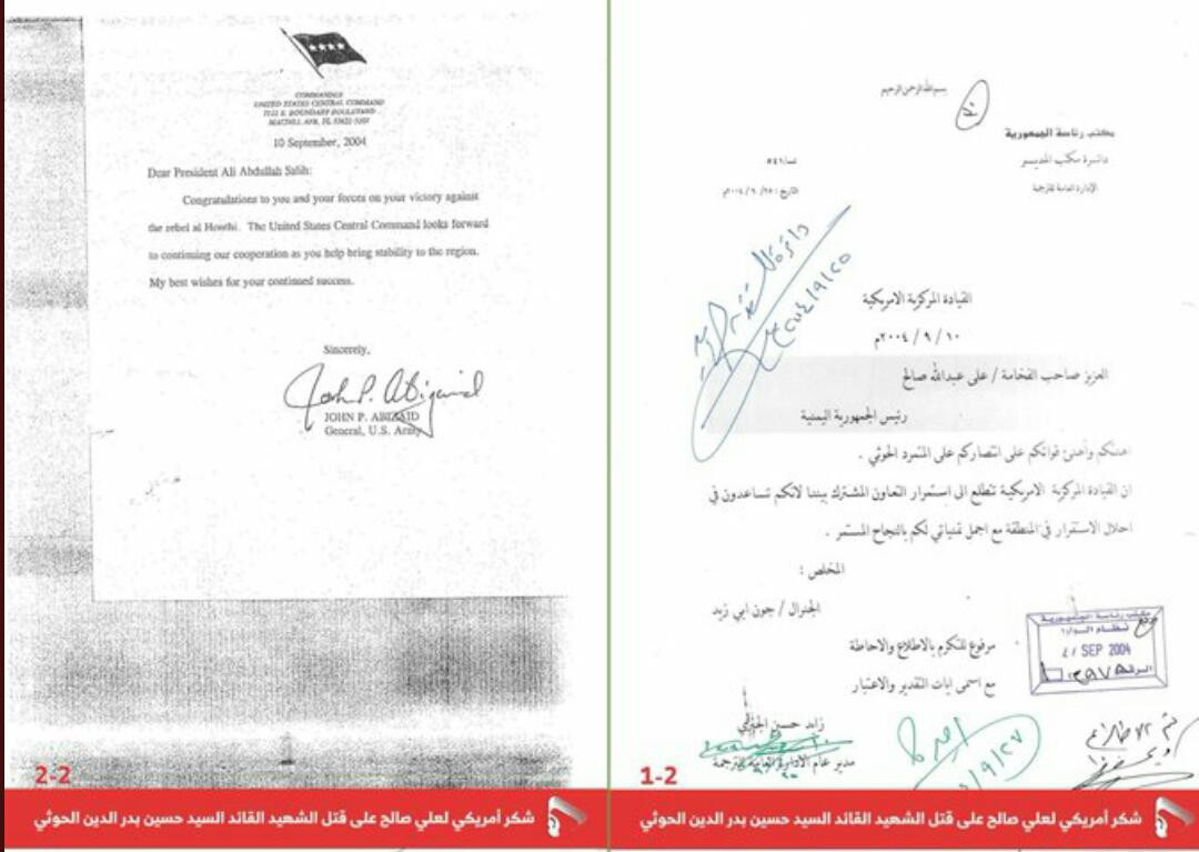 1- رسالة شكر من قائد القيادة المركزية الأمريكية لعلي عبدالله صالح بتاريخ 10/9/2004م