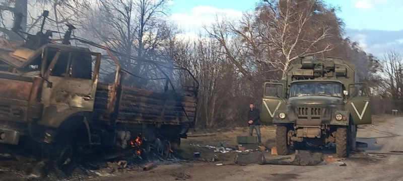 وثقت مجموعة من الصور، تعرض شاحنات إمداد روسية لكمين أوكراني، في منطقة بيرودينكا.