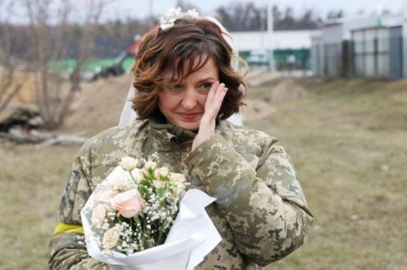 أقامت الجندية الأوكرانية ليسيا إيفاشينكو، حفل زفافها ببدلة عسكرية في كييف، حيث ارتدت أيضاً طرحة العروس.