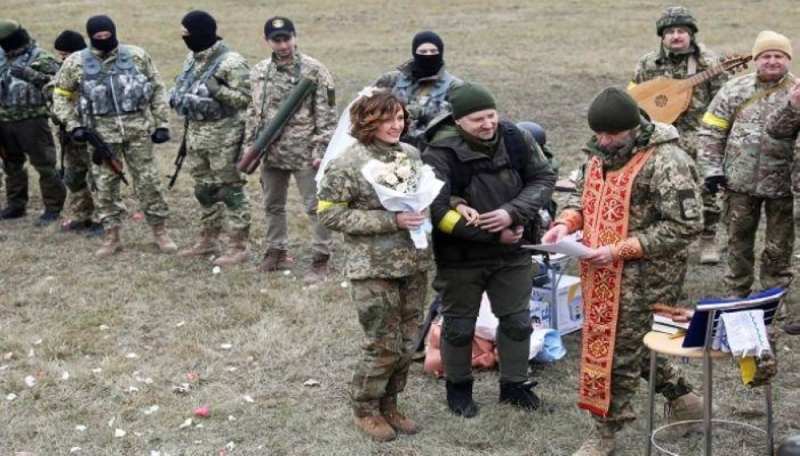 شاهد .. جندية أوكرانية تقيم حفل زفافها في الحرب.. ارتدت بدلة عسكرية بدلاً من فستان العرس