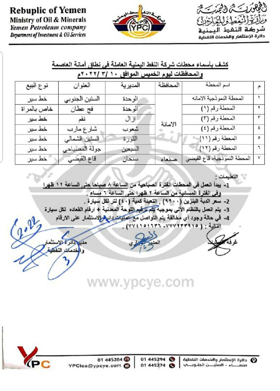 وعمّمت شركة النفط، مساء الأربعاء، كشفاً بأسماء محطات البنزين العاملة في محطات الشركة #بأمانة_العاصمة_والمحافظات ليوم غد الخميس 10 مارس 2022م وبالسعر الرسمي من الكمية الواردة عبر ميناء الحديدة على السفينة الإسعافية “سي ادور”