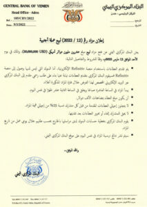 وأعلن البنك المركزي اليمني في عدن، على موقع الالكتروني، عن اعتزامه طرح مبلغ جديد من العملة الأجنبية يبلغ 20 مليون دولار امريكي للبيع على البنوك وشركات الصرافة في المزاد الثاني عشر لهذا العام.