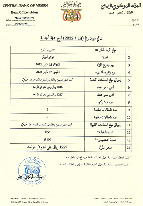 وكان البنك المركزي اليمني في عدن، قد كشف، في وقت سابق، عن شروط وتفاصيل المزاد رقم (13-2022) لبيع مبلغ عشرين مليون دولار أمريكي (20,000,000 USD).