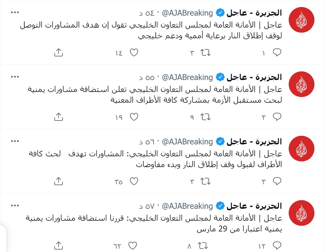 ورد الآن : قناة الجزيرة تقطع بث برامجها وتعلن عن خارطة طريق لوقف الحرب في اليمن وتحركات دولية مفاجئة وغير مسبوقة .. وهذا ما سيحدث نهاية الشهر الجاري بمشاركة الحوثيين