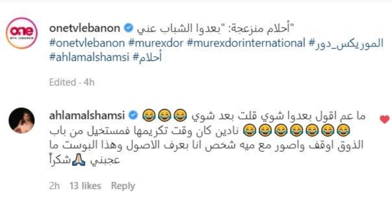 وقالت أحلام، في تغريدة لها عبر حسابها بموقع "تويتر":"ما عم أقول بعدوا شوي، قلت بعد شوي، نادين كان وقت تكريمها، فمستحيل من باب الذوق أوقف وأصور مع 100 شخص.. أنا بعرف الأصول، وهذا البوست ما عجبني".