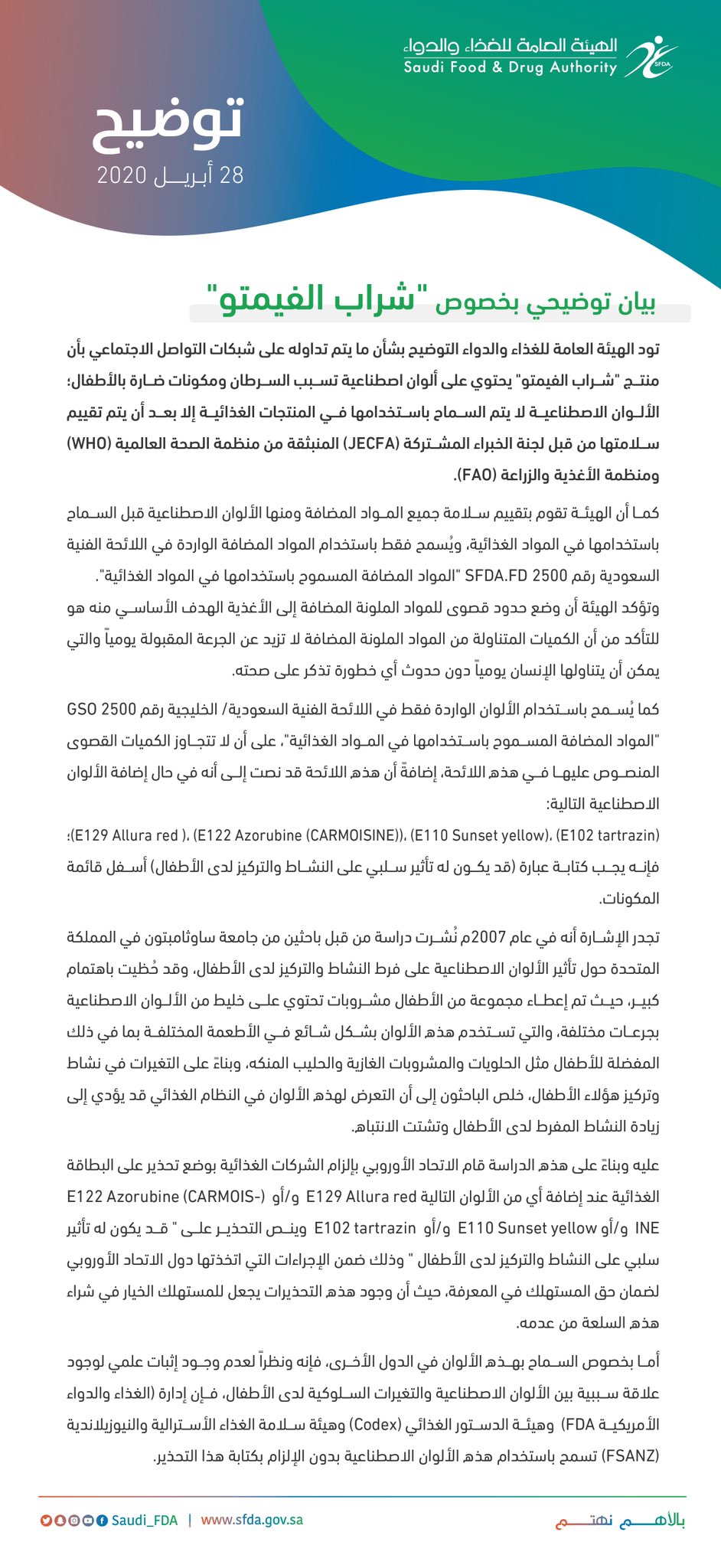 وقالت الهيئة السعودية، في بيان : “لا خطورة من تناول شراب الفيمتو يوميا” .