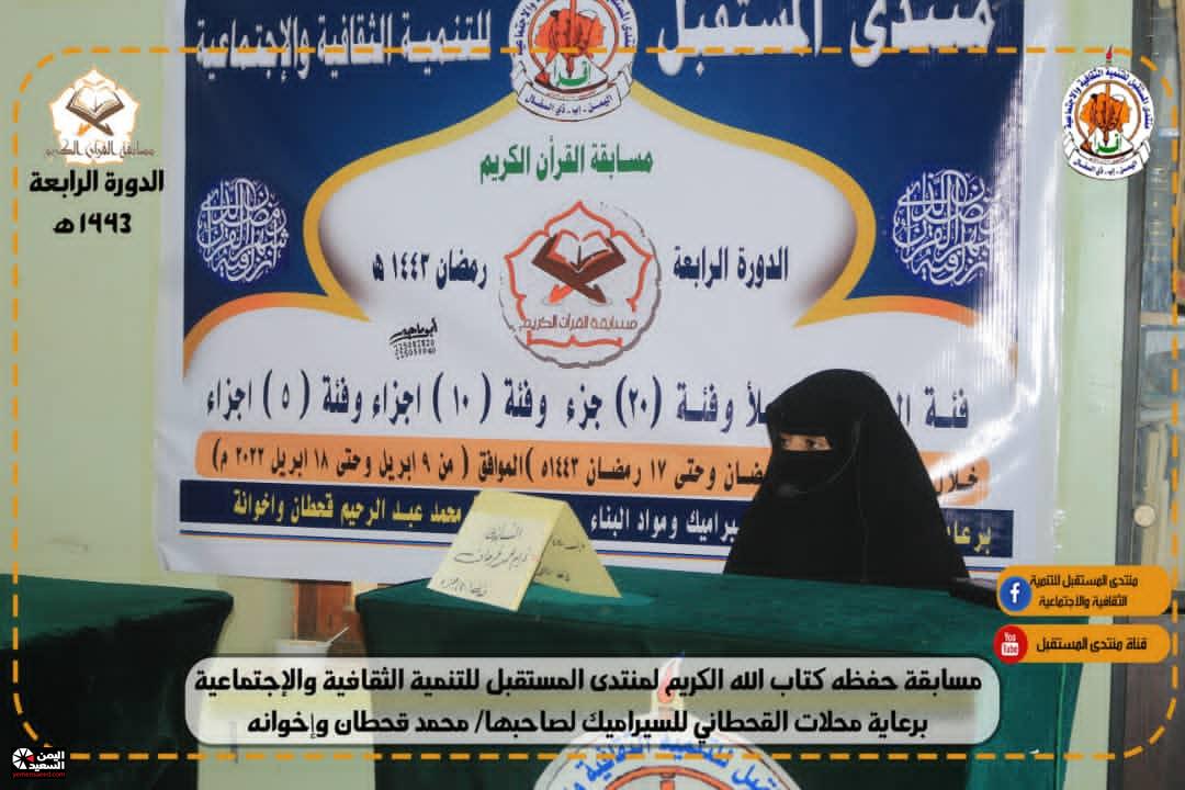 .اوضح الامين العام المساعد للانشطه الاستاذ فواد عامر بان المسابقالقرانيه التي ينظمها منتدى المستقبل للتنمية الثقافية والإجتماعية تقام بدعم من محلات القحطاني للسيراميك ومواد البناء تشهد تنافس بينوالمتسابقين من الذكور والاناث