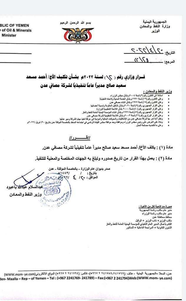وقضى القرار بتكليف المهندس احمد مسعد سعيد صالح الشعيبي مديرا تنفيذيا لشركة المصافي عدن.