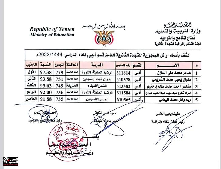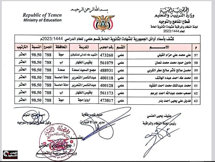 ونشرت وزارة التربية كشف بأسماء أوائل الجمهورية لطلاب وطالبات الشهادة الثانوية العامة بأقسامها (علمي، أدبي، انجليزي).