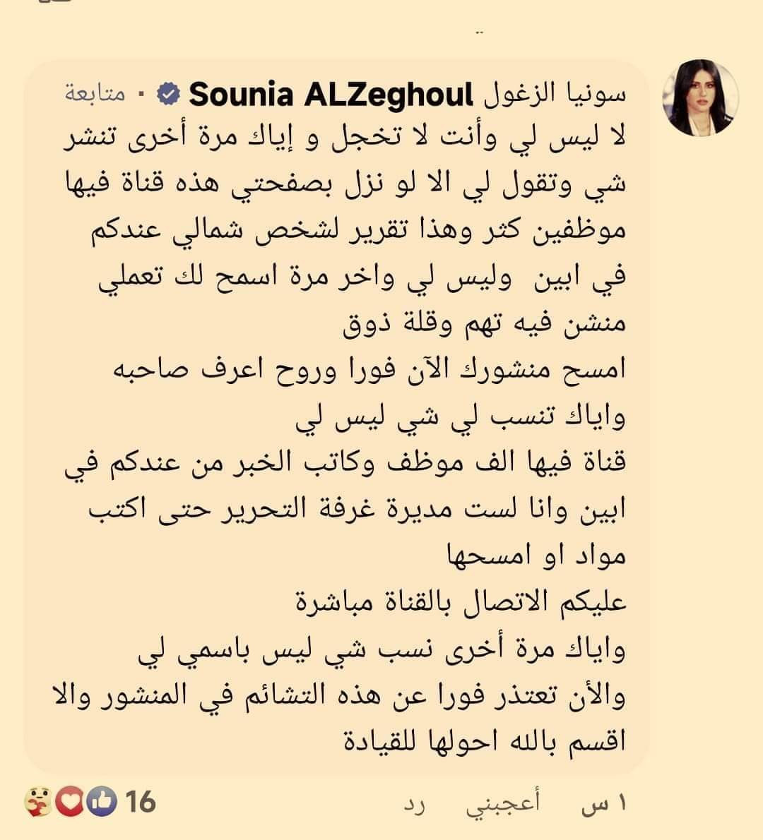 . وهاجمت سونيا الزغول الاعلامي علي عسكر الذي اتهمها بالاساءة للشهيد السيد حيث هددت الزغول عسكر بابلاغ القيادة عن منشوره