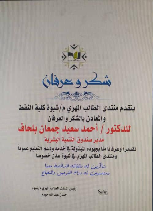 كرم اليوم الاربعاء الموافق ١١/٩/٢٠٢٤ منتدى الطالب المهري بمحافظة شبوة كلية النفط و المعادن،المدير التنفيذي لصندوق التنمية البشرية الدكتور احمد سعيد جمعان بدرع شكر وعرفان تقديرا لجهوده المبذوله في دعم المنتدى وطلاب المهرة الدارسين في محافظة شبوة.