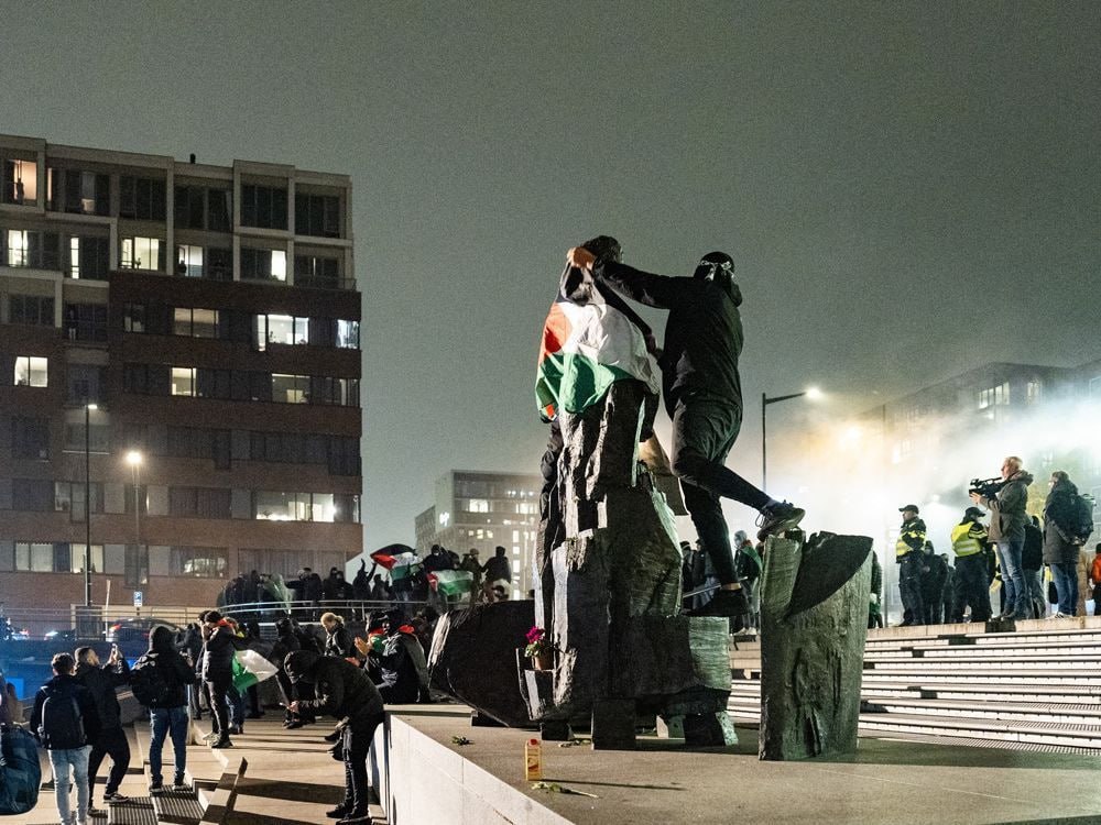 وأفادت القناة 12 الإسرائيلية، بأن توترا تصاعد بين مشجعي "مكابي تل أبيب" ومؤدين لفلسطين بعد أن قام مشجعو الفريق الإسرائيلي بإنزال وتمزيق العلم الفلسطيني من على إحدى المباني واستفزوا سائقي سيارات الأجرة الهولنديين من أصل عربي.