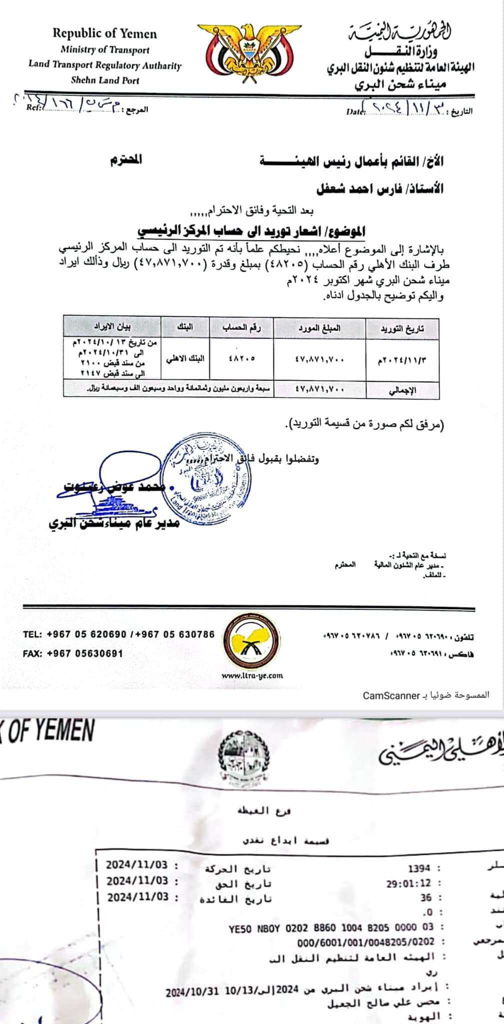 فضيحة مدوية تهز مرفق تابع لوزارة النقل يورد دخله الى بنك خاص بدلا من البنك المركزي بعدن