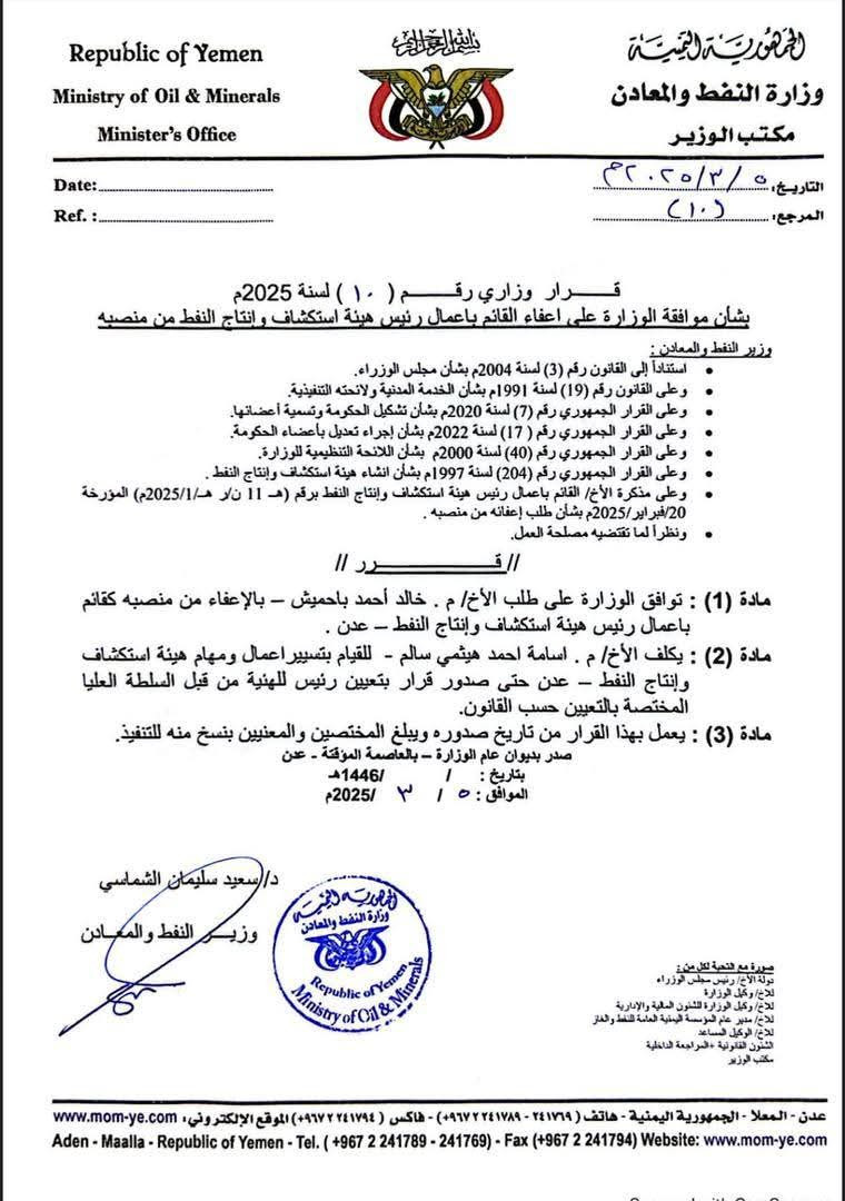 في تطور صادم، قدم رئيس هيئة استكشاف وإنتاج النفط، خالد باحميش، استقالته رسميًا، كاشفًا عن سلسلة من الخروقات القانونية والتجاوزات الخطيرة داخل وزارة النفط، وعلى رأسها تمكين شركة OMV النمساوية من الانسحاب دون الالتزام بشروط الاتفاقية.