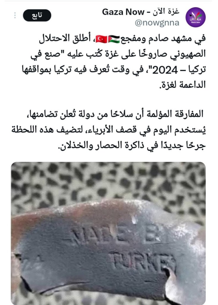 التي ترفع شعار دعم الفلسطينيين وتدين ما يجري في غزة، تُشارك فعلياً في العدوان من خلال توريد السلاح للاحتلال. وقال أحدهم: الاحتلال يقتلنا بصاروخ تركي! تركيا التي تتحدث عن التضامن معنا، تساهم في قتلنا بسلاحها؟.