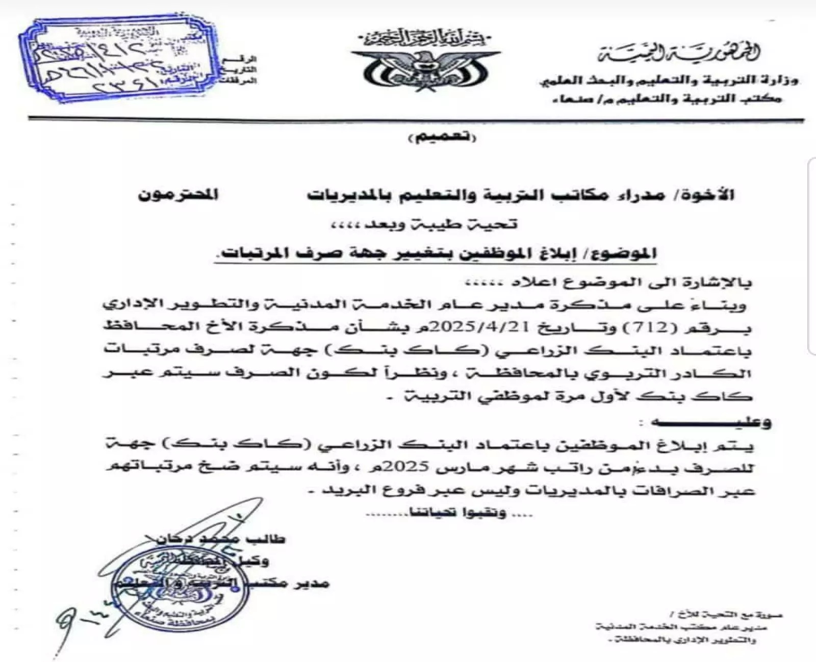 تعميم رسمي باسم البنك اليمني الجديد الذي أوكلت إليه مهمة صرف مرتبات المعلمين وموظفي التربية